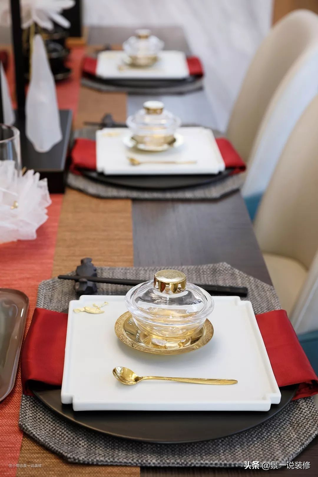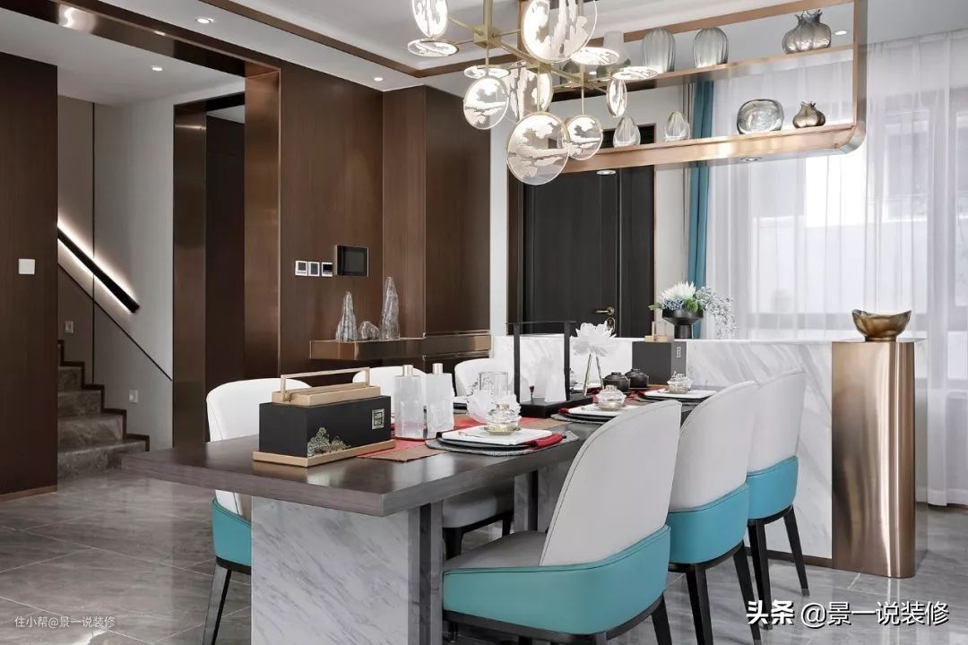 餐厅依岛台立,湖水蓝与桌面软饰中的落霞红相映,静谧中透着欣愉,每件餐具都晶莹剔透,异常精美。