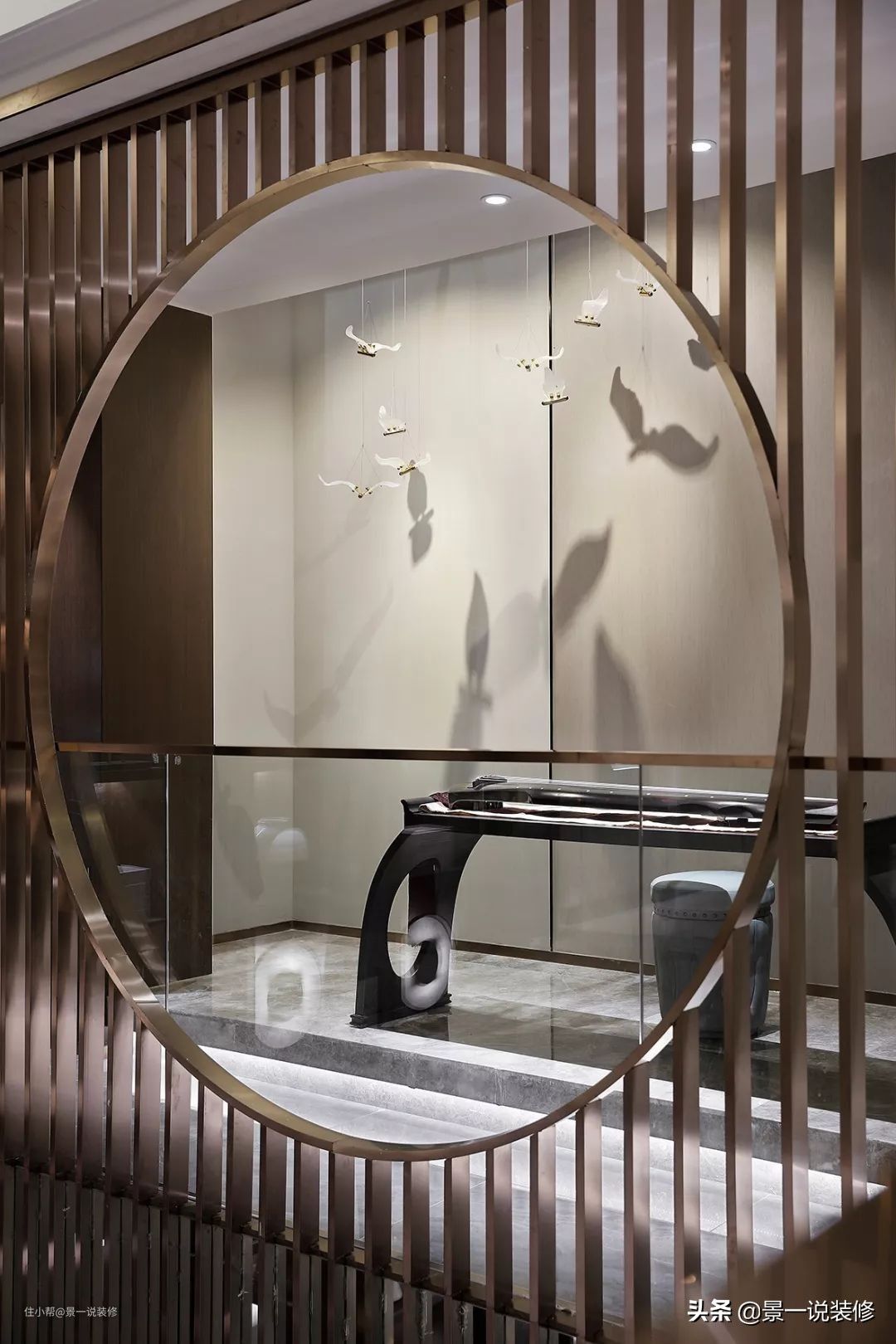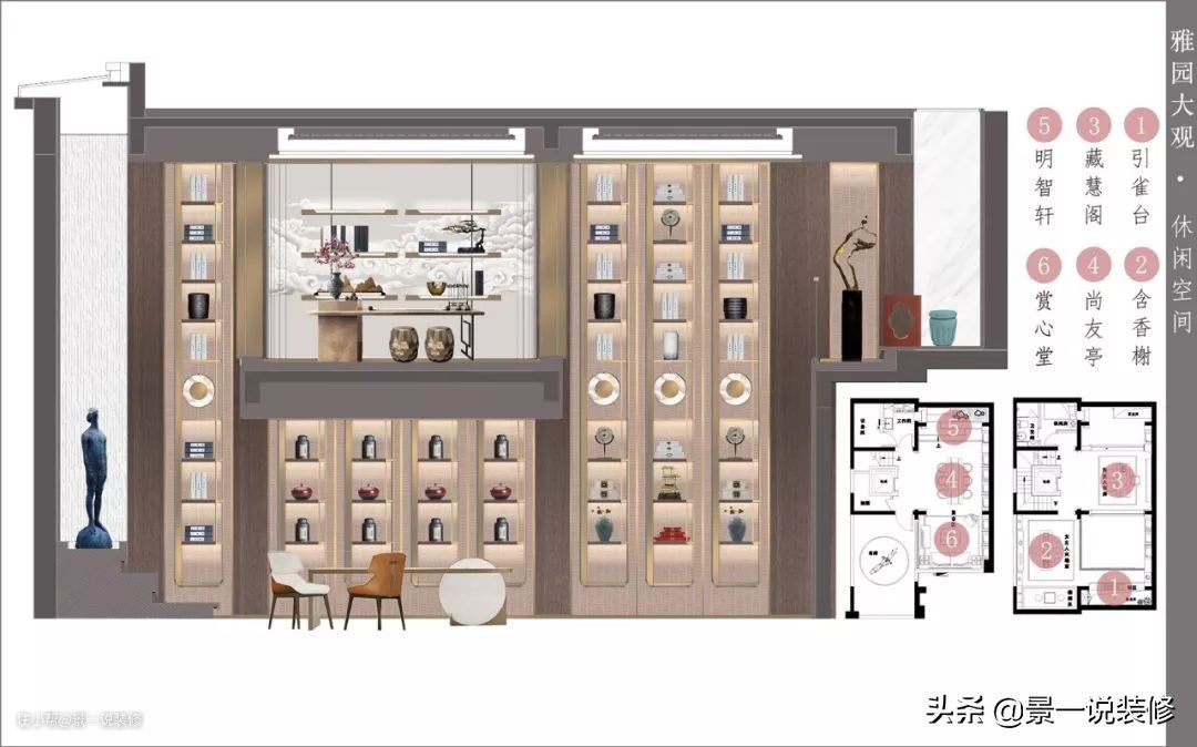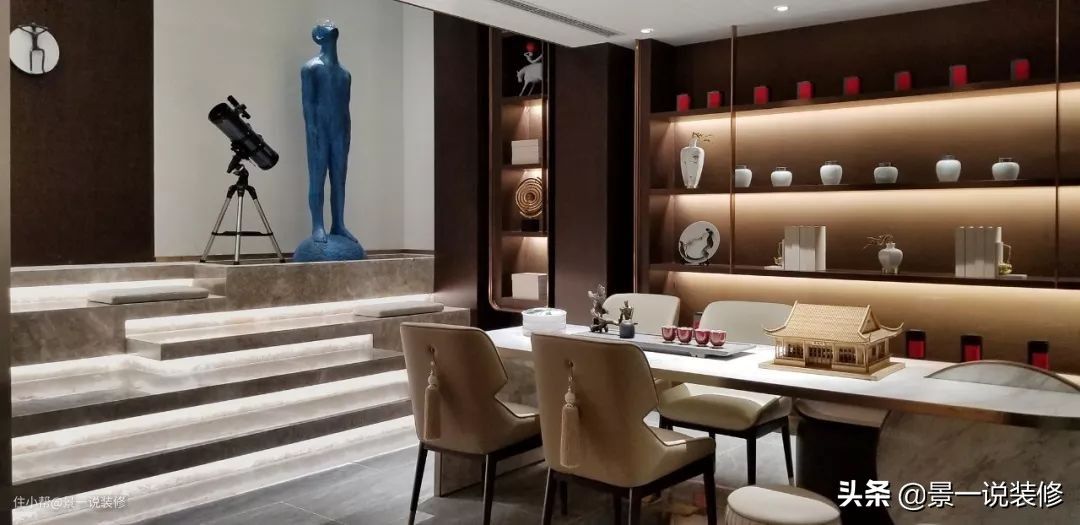 地下的两层空间,从客厅的空间背景白描胜景图中描述了设计师的灵感伏笔,那亭台楼阁喻意为地下层内赋名的亭、台、楼、阁、轩、榭6个功能区,地下层有一个共享空间位于中心位置,连通南北采光天井。光线由南至北穿透并达地下二层空间,让人仿佛进入了一个浓缩的大观园中。体验这诗情画意般的情趣生活。