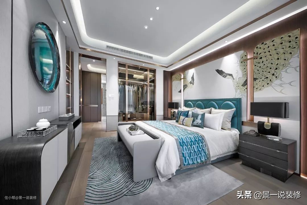 主卧室在地面二层,外带阳台,床头背景绘有金凤,凤翅鎏金造型,有着美好的寓意,阳台上可远眺西山胜景。