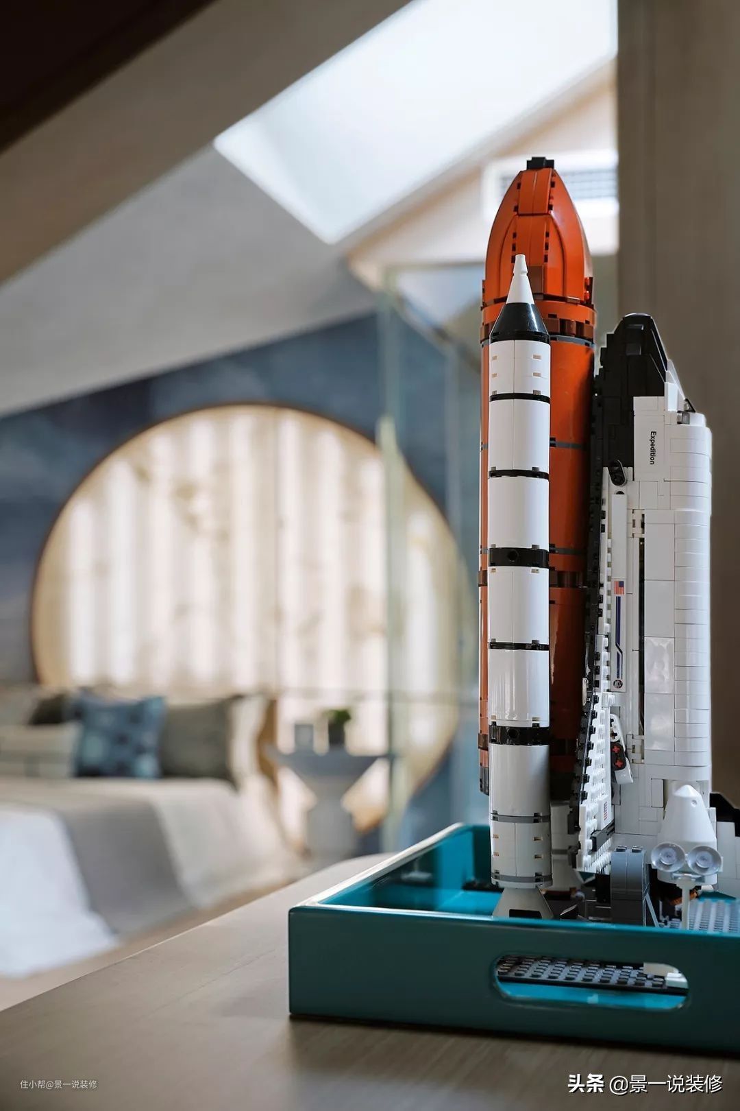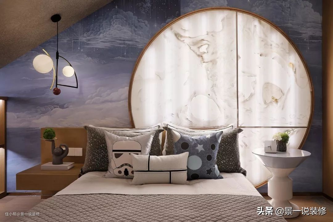 男孩房在最顶层的阁楼,虽然层高有些受限,但是更是一处独立的私人空间,整个功能划分为与朋友聚会区、读书区、睡眠区,独立卫生间与洗浴区,床头主背景图案,让人联想到要去探索的孤独星球。
