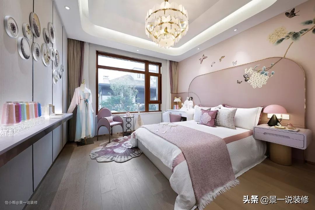 女儿房作为女生的闺阁,藏满了许多小小心思,床背景的墙纸是一幅蝶恋花的刺绣图,与床屏恰到好处地连在一起,灰紫色调凸显出女孩的清丽脱俗,房间角落处还摆有一身华丽汉服,仙气十足。