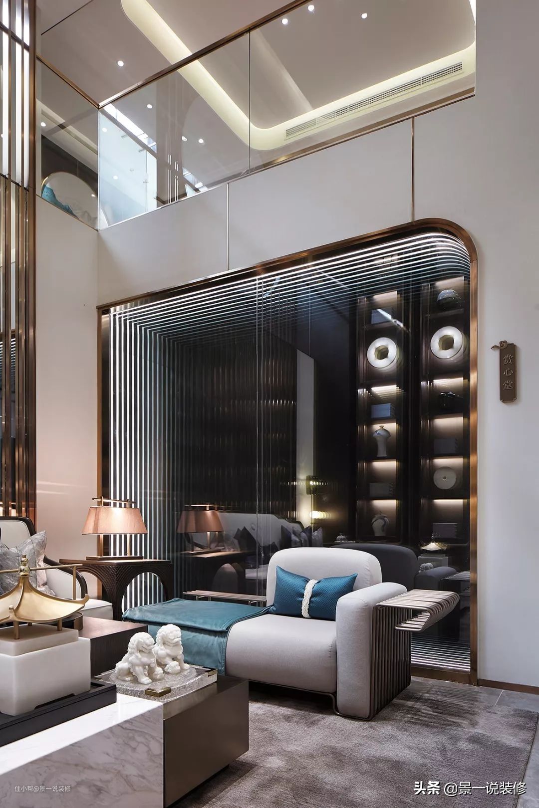 赏心堂的设计很有豪宅别墅气度,高达两层的背景柜内摆满了各种艺术精品,赏心堂的装饰融合了古典与现代手法,沙发背景借景引虚,让视觉上得到延展。
