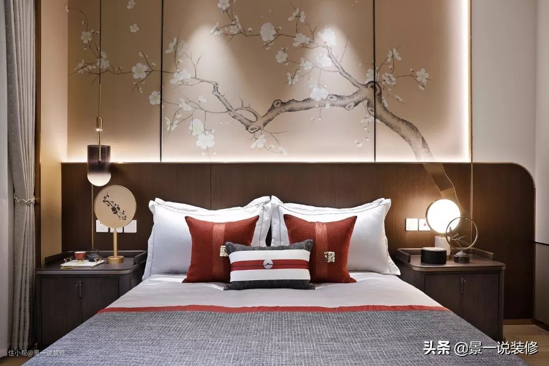 老人房在地面一层,以梅为主题,空间色调沉稳优雅,床头用手绘梅花枝干与不锈钢做背景,传统的中式元素中注入时尚品味。