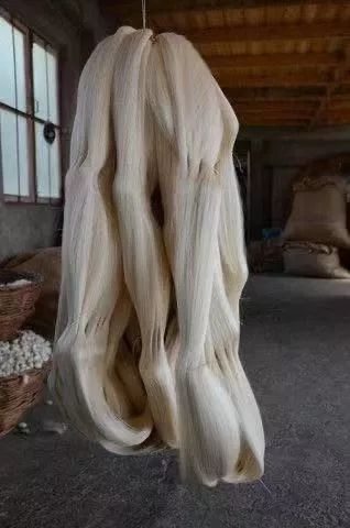将清洁并晒干后的马毛进行梳理,然后编织成马毛辫。通过10-15分钟的旋转,将大量马毛纤维揉成一根25公斤重的马毛辫,辫子越紧越好。