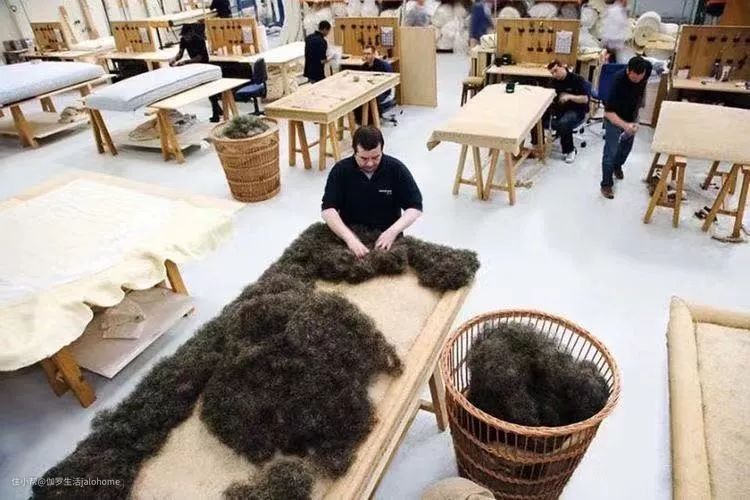 对于马尾毛的品质甚至产地,顶级品牌都有自家的讲究。Hästens只从马尾中间一段,选取最长最坚韧的马尾毛,以获得最好的弹性。