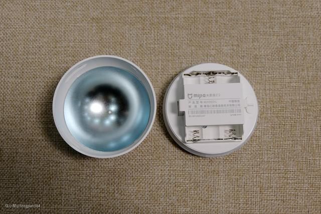 灯体部分是旋转式的拆开方式,分体后内部一览,球形的背壳内层有大面积的银色金属材质,方便底座吸附,主体部分上是固定电池和亮度开关,安装电池的仓槽上方有盖扣固定▼