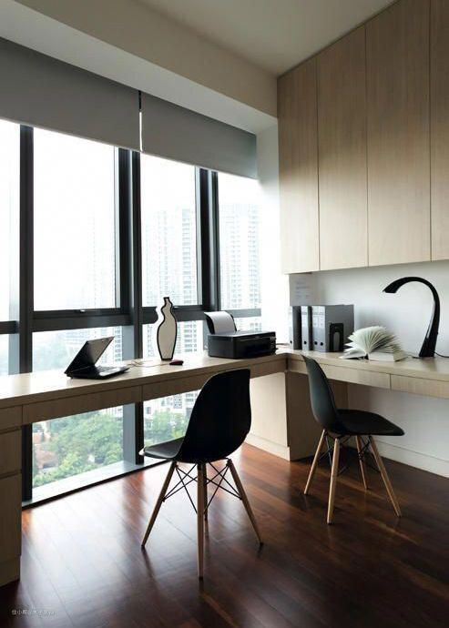 台面上方增加一个抽屉储物柜,在依墙定制储物架和书架,不仅可以装饰空间,而且能打造出绝佳的阅读区。