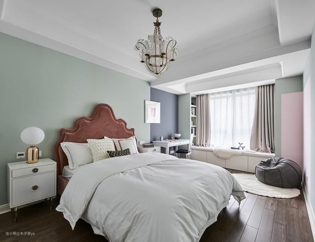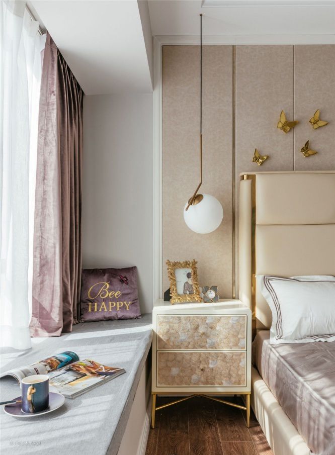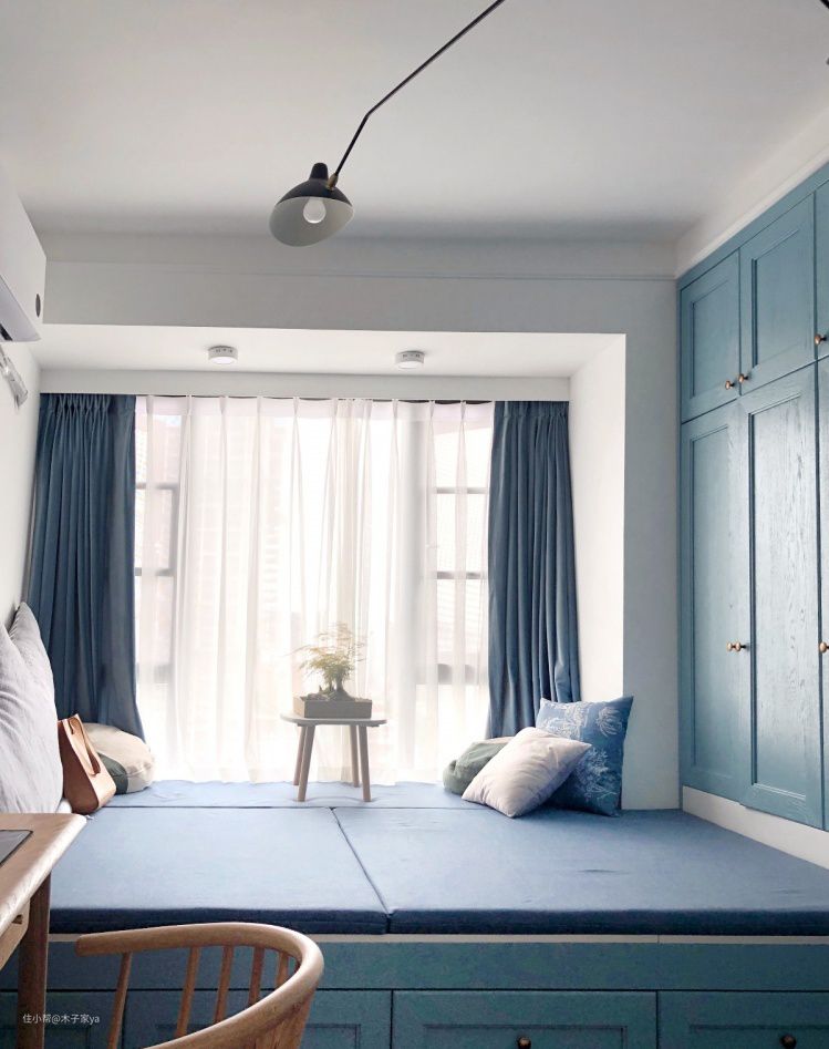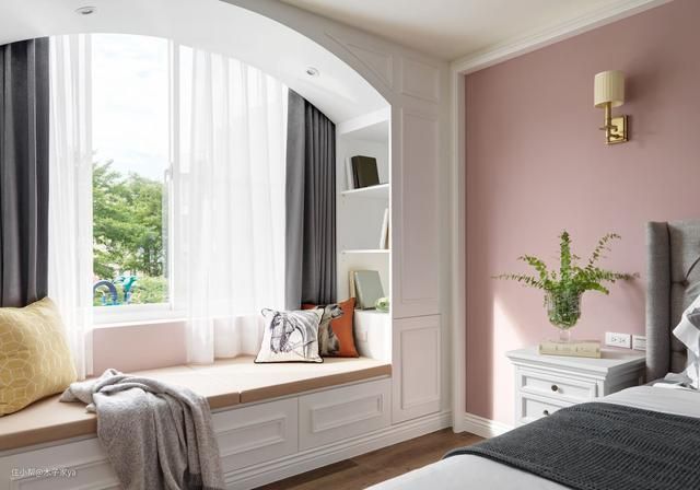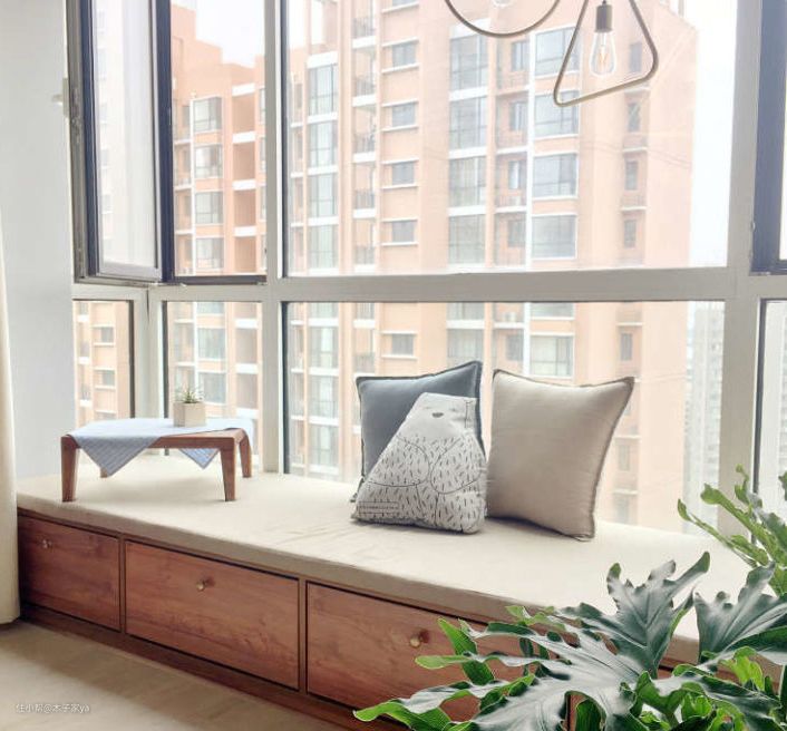 带台阶真飘窗打造要点:这种飘窗本身有墙体,可以直接在墙体上面铺上飘窗垫即可。如果有些墙体很低矮,低于30cm高度,可以在上面加抽屉柜20cm,再铺垫子,这样整体高度才坐着舒适。