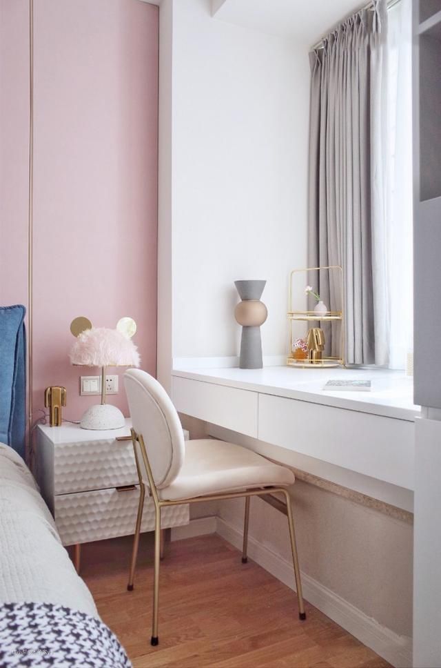 第二种方案:或者可以打掉的位置梳妆台可以做成和飘呈“L”型,书台有一部分搭到飘窗上,延伸桌面长度。这样既节省空间又好看。