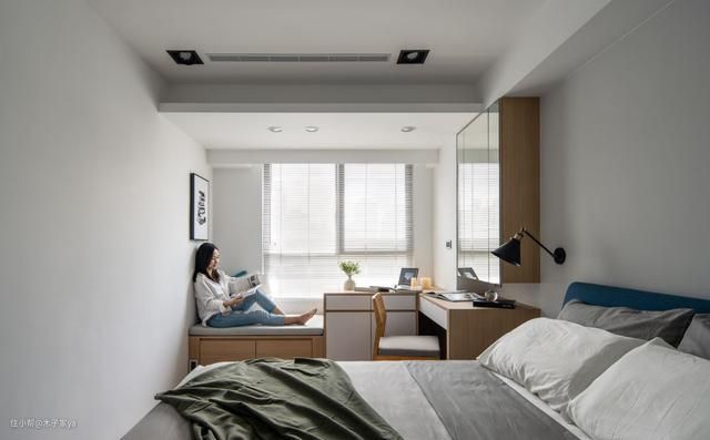 第二种方案:卧室面积非常小,可以选择一块厚实隔板,与飘窗垂直,巧妙纳入飘窗空间。