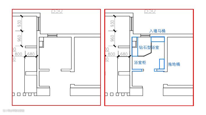 次卫:次卫改动了门的位置,墙体没有大的改动,同样也做了干湿分离,次卫做了钻石型的浴室房,次卫的浴室柜比较小,仅0.7m宽,同样安装0.7米的智能除雾浴室柜。门后预留了拖地桶的位置,方便以后打扫。