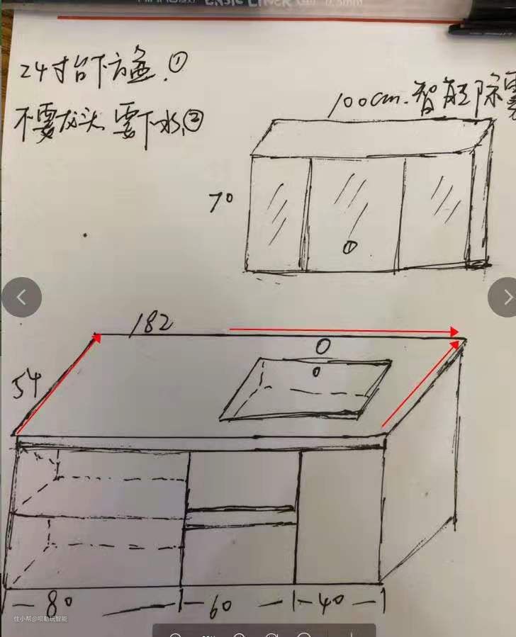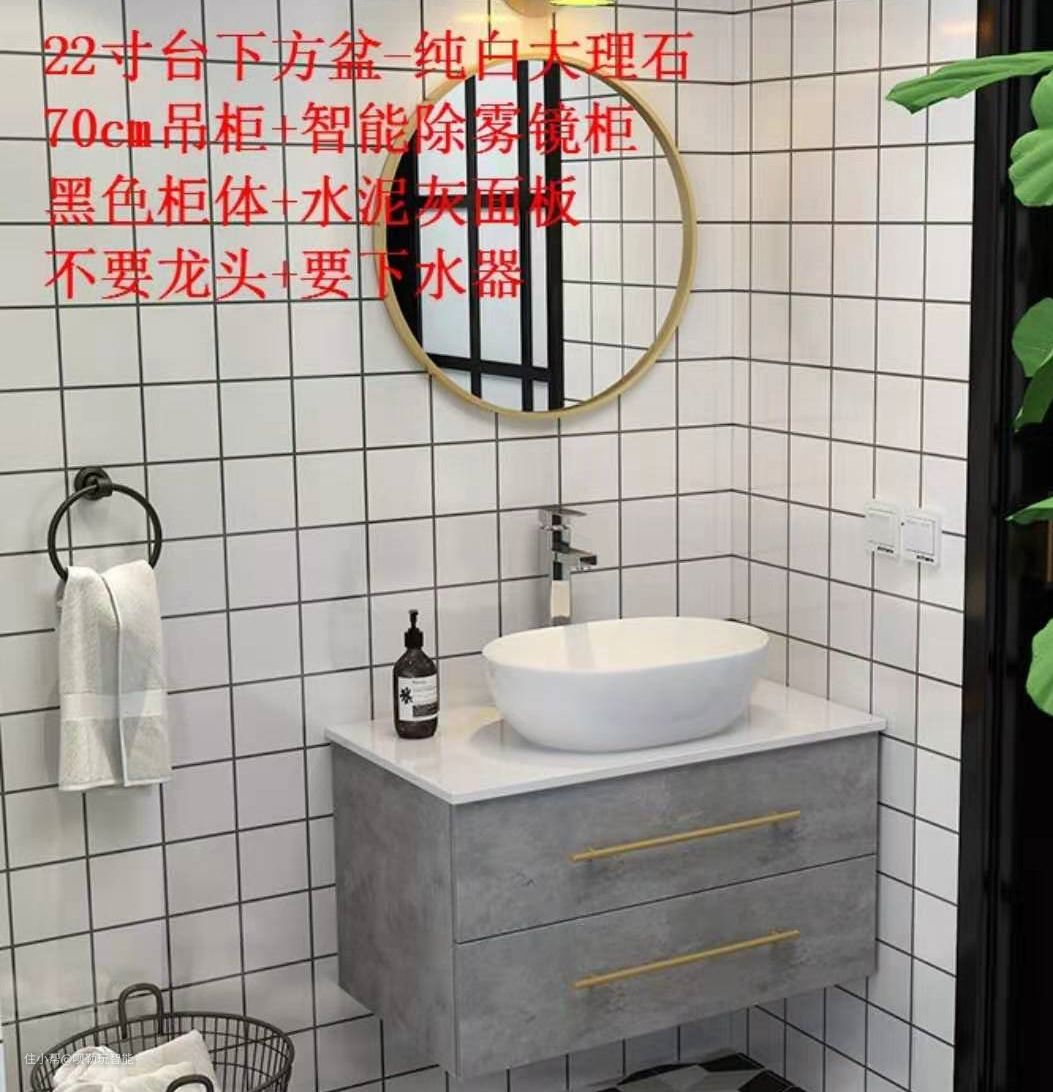 浴室柜:主卫1.8米浴室柜,次卫0.7米浴室柜,水泥灰风格浴室柜+黑色柜体+智能除雾镜。多加钱用了智能除雾镜,避免洗澡后满镜子的雾气。主卫的浴室柜因为挡着马桶了,所以一边做了开放格。