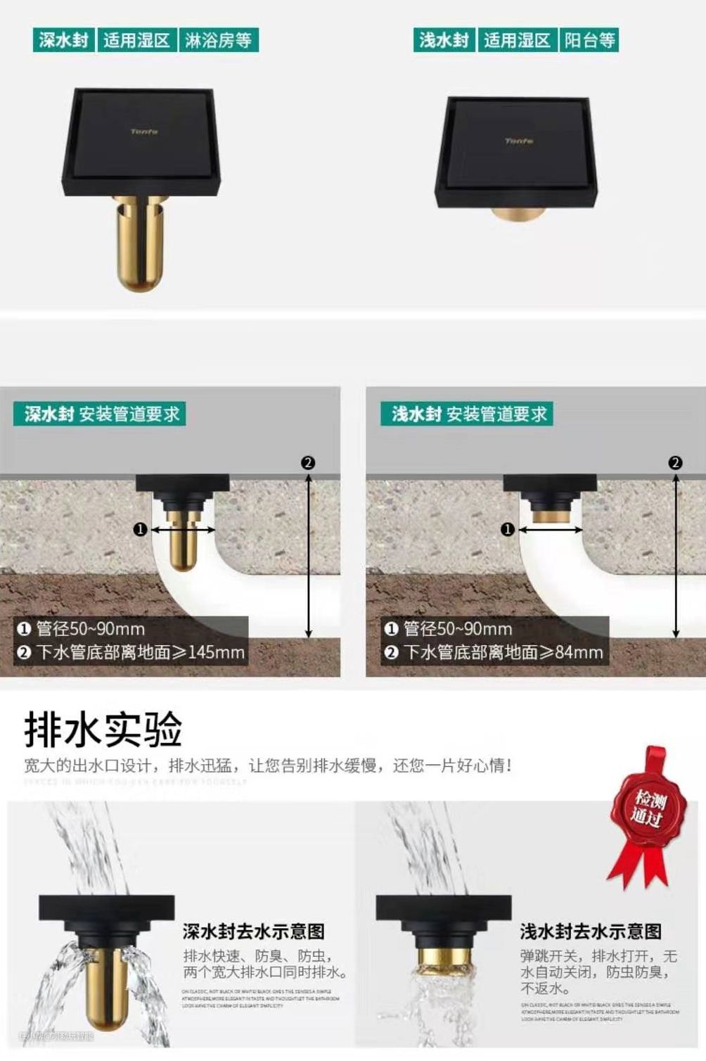 地漏:地漏也选择了干区和湿区的俩种,干区选择的是浅水封的地漏,湿区选择的是深水封的地漏。深水封需要管径在50-90mm,下水管底部距离地面145mm以上,潜水封管道直径要求50-90mm,下水底部距离地面大于84mm。