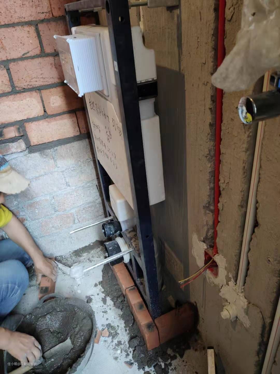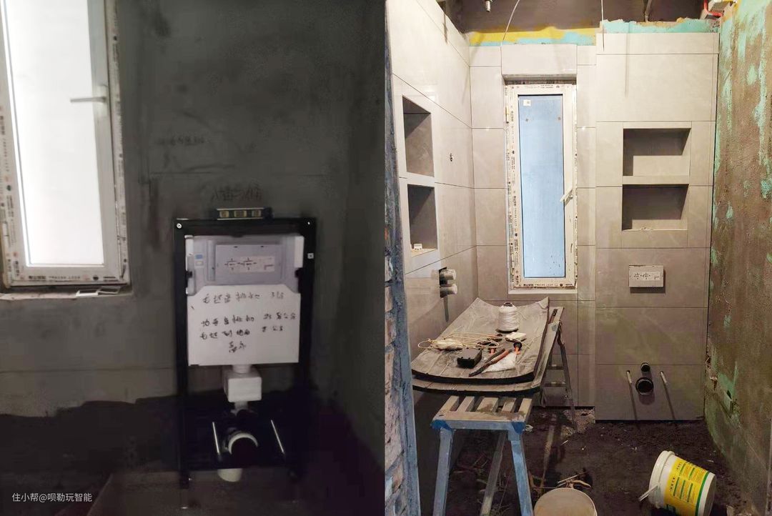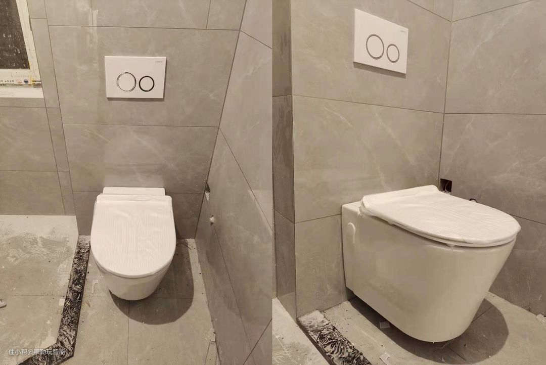 马桶:马桶选择的是HPCC的入墙式壁挂马桶。在马桶旁预留电源插座和手持喷枪的水位。需要注意的是在改水电的时候,需要先安装壁挂马桶的水箱架,水箱架有3种。如果是承重墙可以选择两脚水箱,如果是非承重墙需要选择四脚水箱,如果是装按键在上方的需要安装低矮水箱架,我家安装的是两脚水箱架。主卫使用的是智能马桶,次卫使用的PP盖板。