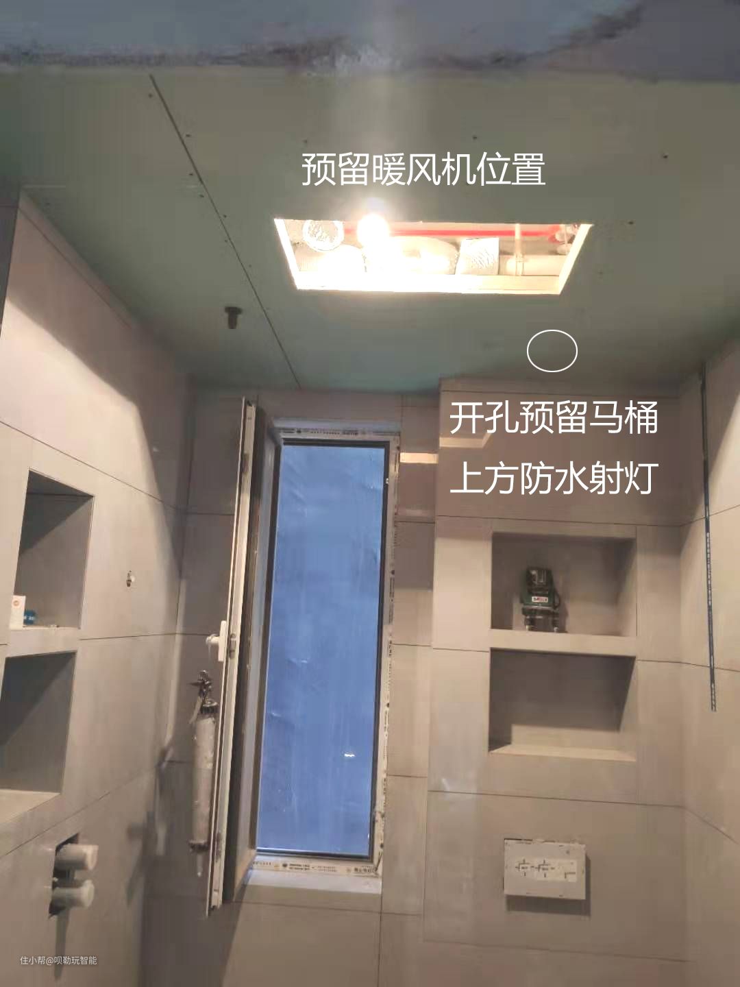 灯光:除了浴霸的灯光之外,还有智能除雾镜的镜前灯,在马桶和浴室柜的上方,还预留了2个射灯。