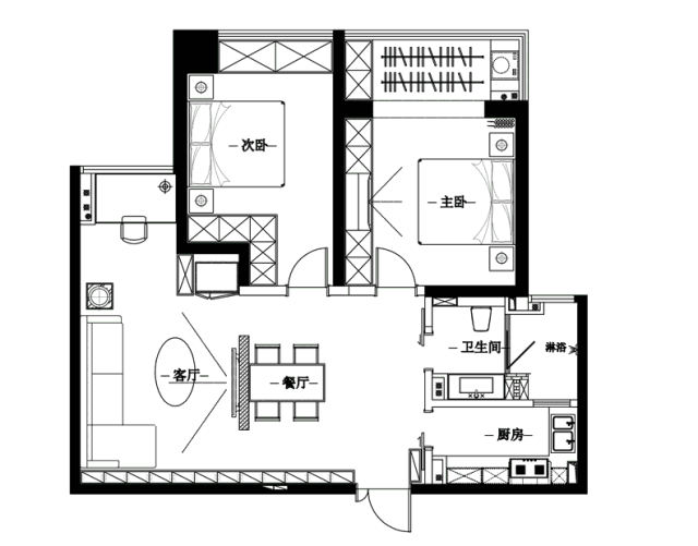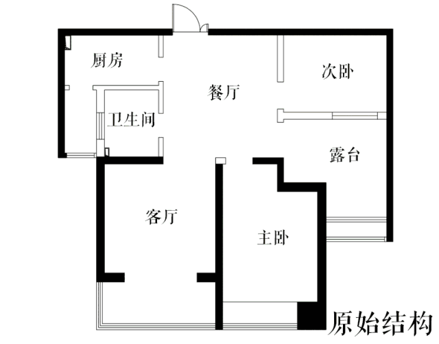 本户型虽然是个两室两厅,但是原本的布局让空间太过压抑,使得从视觉看根本想象不到这是个快90平米的房子。另外,原始户型没有合理划分空间,且各个功能区之间太过独立,没有互动性。针对这种“难点户型”,我们必须进行合理拆除非承重墙体,重新进行动线布局,改善原始户型存在的问题,达到居住平衡。