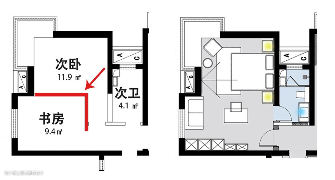 ▲打掉书房与次卧之间的墙体,把整个书房归纳到次卧,让空间格局变规整,满足屋主对大空间的需求。