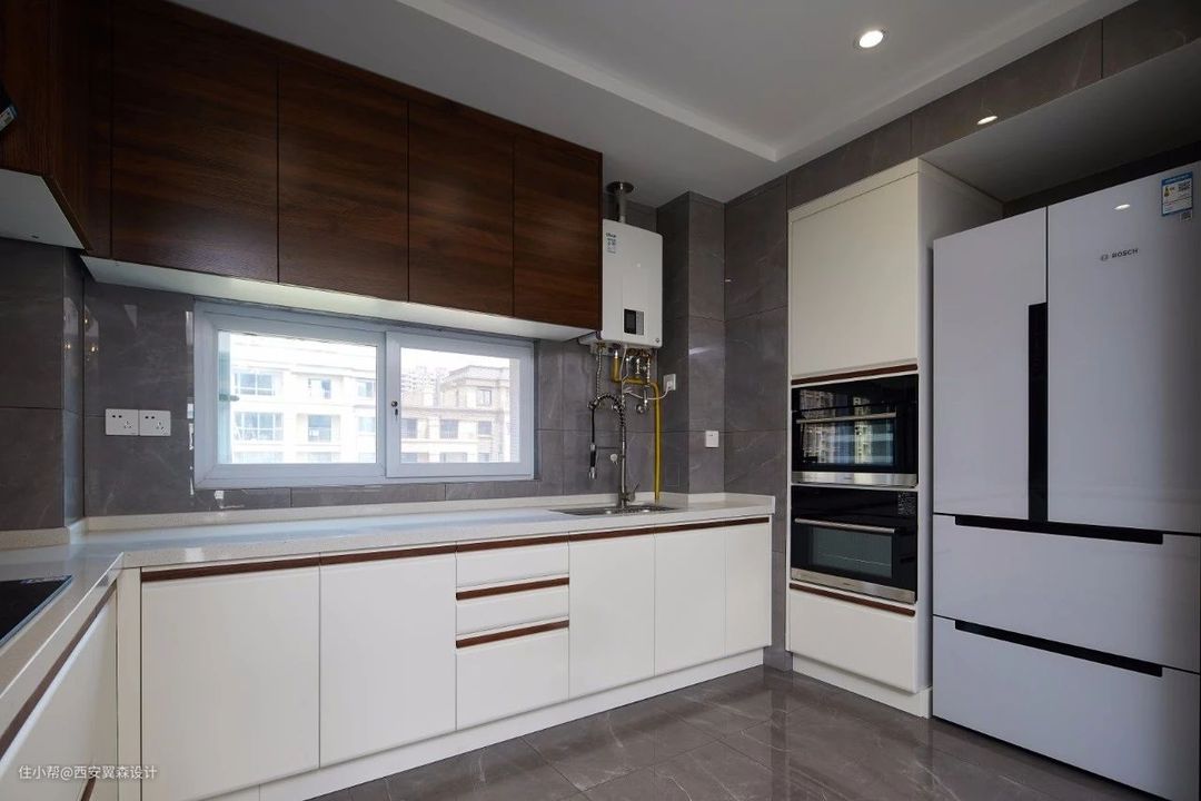 借用空调设备室的部分空间,做了一个壁龛,将电器高柜与对开门冰箱嵌入墙体,不会显得突兀,也不会影响厨房动线。