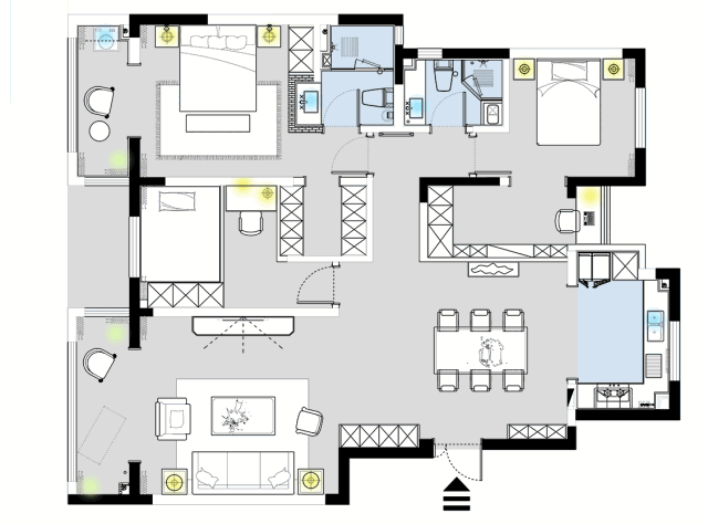对于四居室的改造,我们应该注意功能区的合理划分,舍弃掉不需要的空间,从而扩大必备空间的使用面积,提升空间的协调性和整体性,加强空间的功能属性和视觉吸引力。