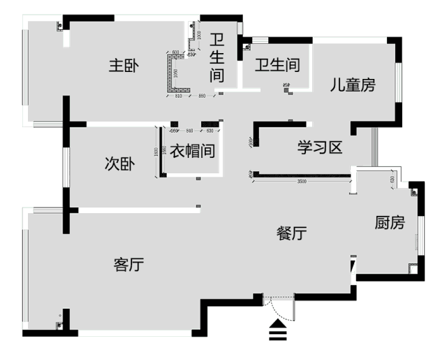 砸掉原户型次卧与餐厅相连的非承重墙体,将餐厅的一部分纳入儿童房,增加学习区,并将次卧改为儿童房,满足日常使用需求。