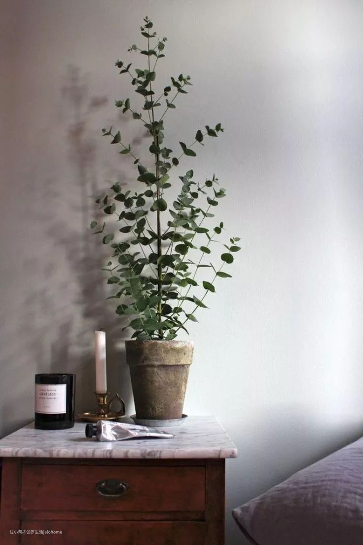 这个”桉”,就是我们小时候吃的桉叶糖的”桉”——好像暴露年龄了啊……不晓得现在的小朋友,还吃不吃桉叶糖这种零食了。桉属的植物,叶子多半有股刺激的香气,有些类似小时候吃过的桉叶糖,有些甚至像药水肥皂。很多澳大利亚土生的桉属植物,为了应对强烈的阳光,会长这种灰蓝色的革质叶片,上被一层白霜。和饱和度高的翠绿色叶子相比,这种灰蓝的叶片,显得特别斯文,有种雅致的、自来旧的感觉,和那种黑白灰性冷淡风格非常搭配。看色板!