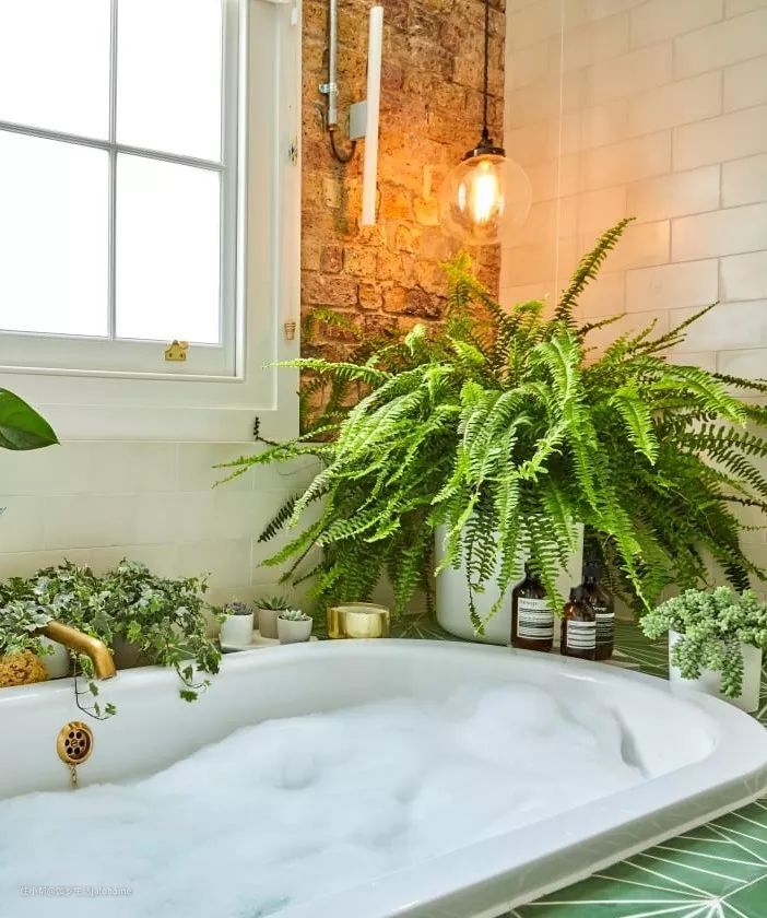 还记得上次讲过的结构的重要性吗(戳这里看我们写绿植选品、结构和搭配的稿子)?波士顿蕨结构鲜明,摆在面积较大的浴缸边上,就比较有存在感。相比起来,在这里,铁线蕨那种较为松散没型的结构,就不如波士顿蕨理想。