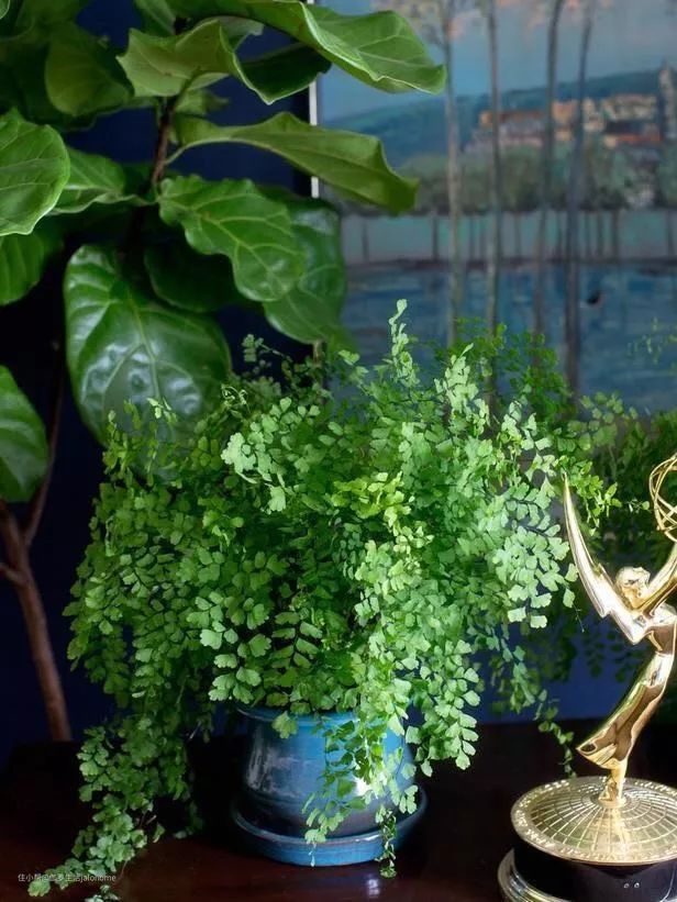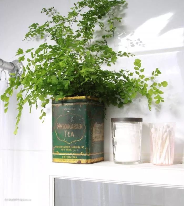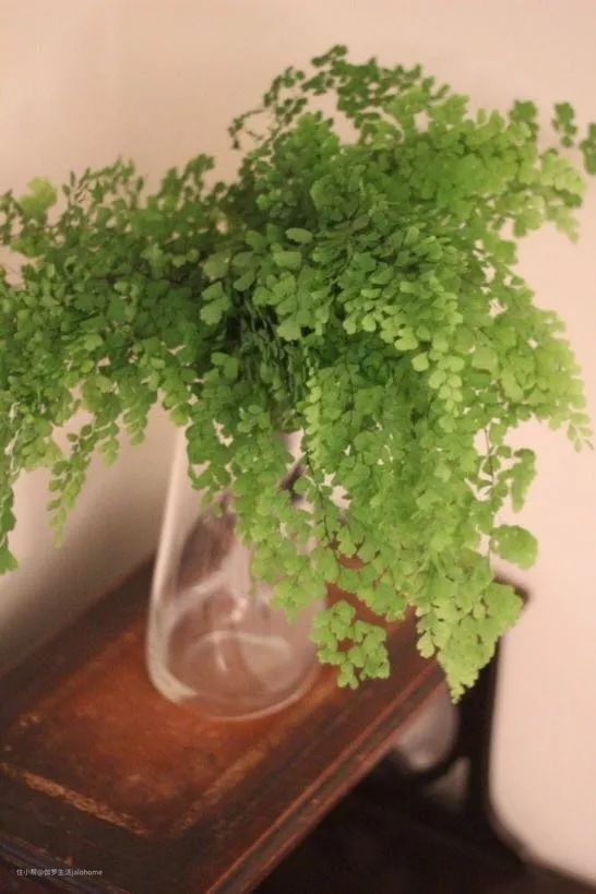 铁线蕨的叶柄纤细,叶片轻盈,带着细碎不规则的“花边”,气质有点小仙女,不喜欢阳光曝晒。这种富有女性气质的植栽,摆在梳妆台一角,和原木大梳子、透明香水瓶摆在一起,就比较合衬。如果一边有加湿器的话,铁线蕨心情就更好啦。