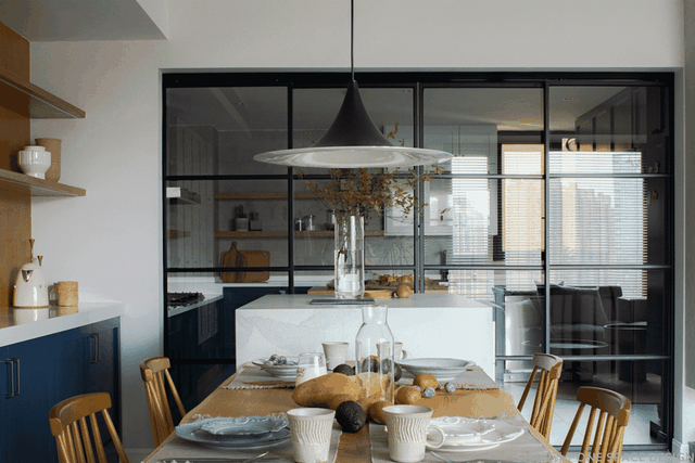“至于油烟问题,我们采用了推拉门“隐藏”设计,日常开放,做饭时拉出来形成良好的密闭空间防止油烟。”