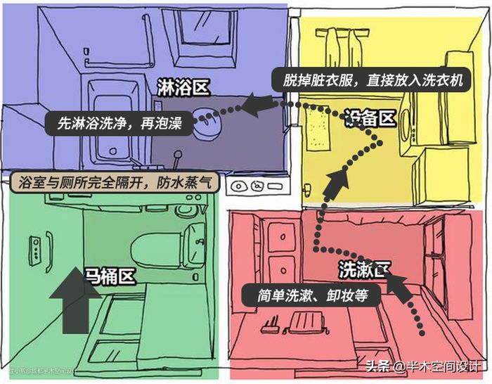 2、完全隔离水气的「三分离」做法有利有弊,其最大亮点在于洗浴的「动线设计」,不可生搬硬套。