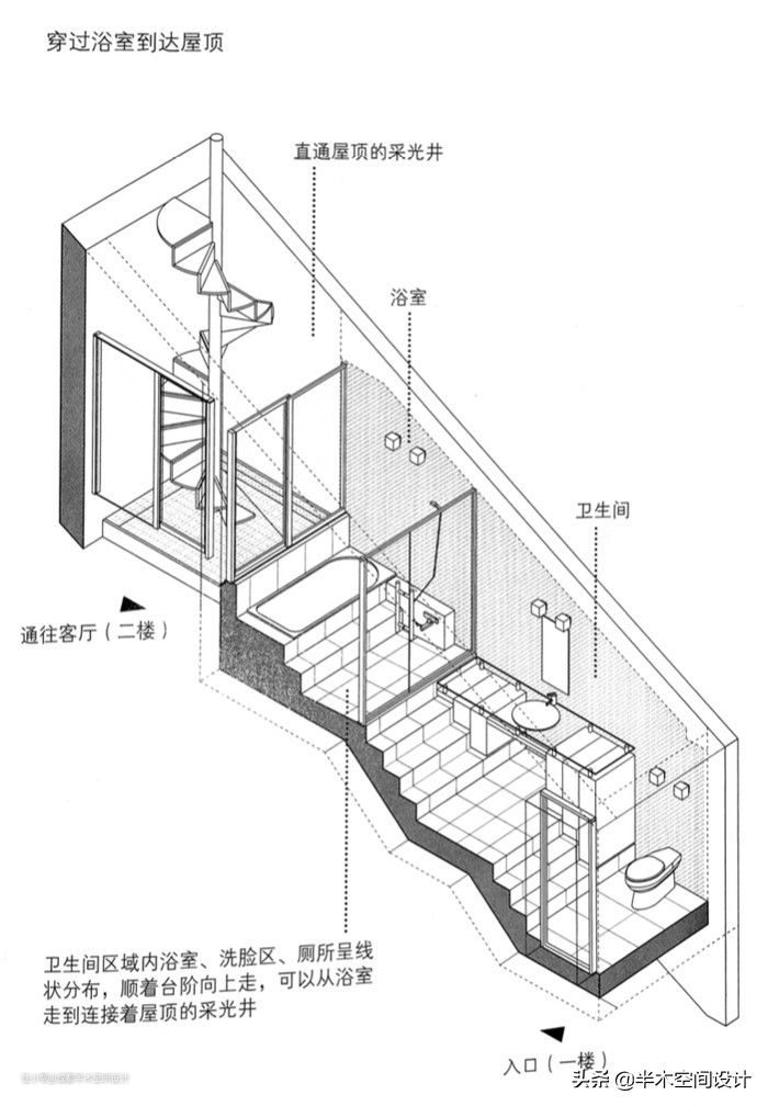 ▲「很多人认为浴室内尽量不要设置台阶,这一观点有一定的道理,从老年人等行动不便的人的角度考虑,则更应该遵循这项设计原则。但是,如果我们打破这一固定看法,尝试建一个台阶式的浴室,就会发现许多不同的东西。在一楼卫生间入口处沿厕所、洗脸池、浴室的顺序向前,地势逐渐升高。卫生间尽头是采光中庭,中庭内有螺旋楼梯,沿着楼梯可以到达屋顶。台阶式卫生间既保护了隐私,又带有“奔向天空”的开放感。」——《日系美宅 打动人心的家这样设计》