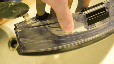 打开上面的盖板,科沃斯T5挂着430毫升容量的尘盒,并且提手设计单手就可以拿出来,倒垃圾时的操作也单手可以解决,便捷性不错。