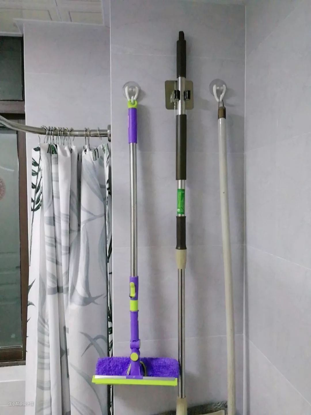 考虑到卫生间的墙面一般都贴墙砖不怕脏,而且这里洗拖把也比较方便,所以在卫生间的空墙上装上挂钩,拖把扫把用完后洗干净就可以挂上去了,非常的方便实用。