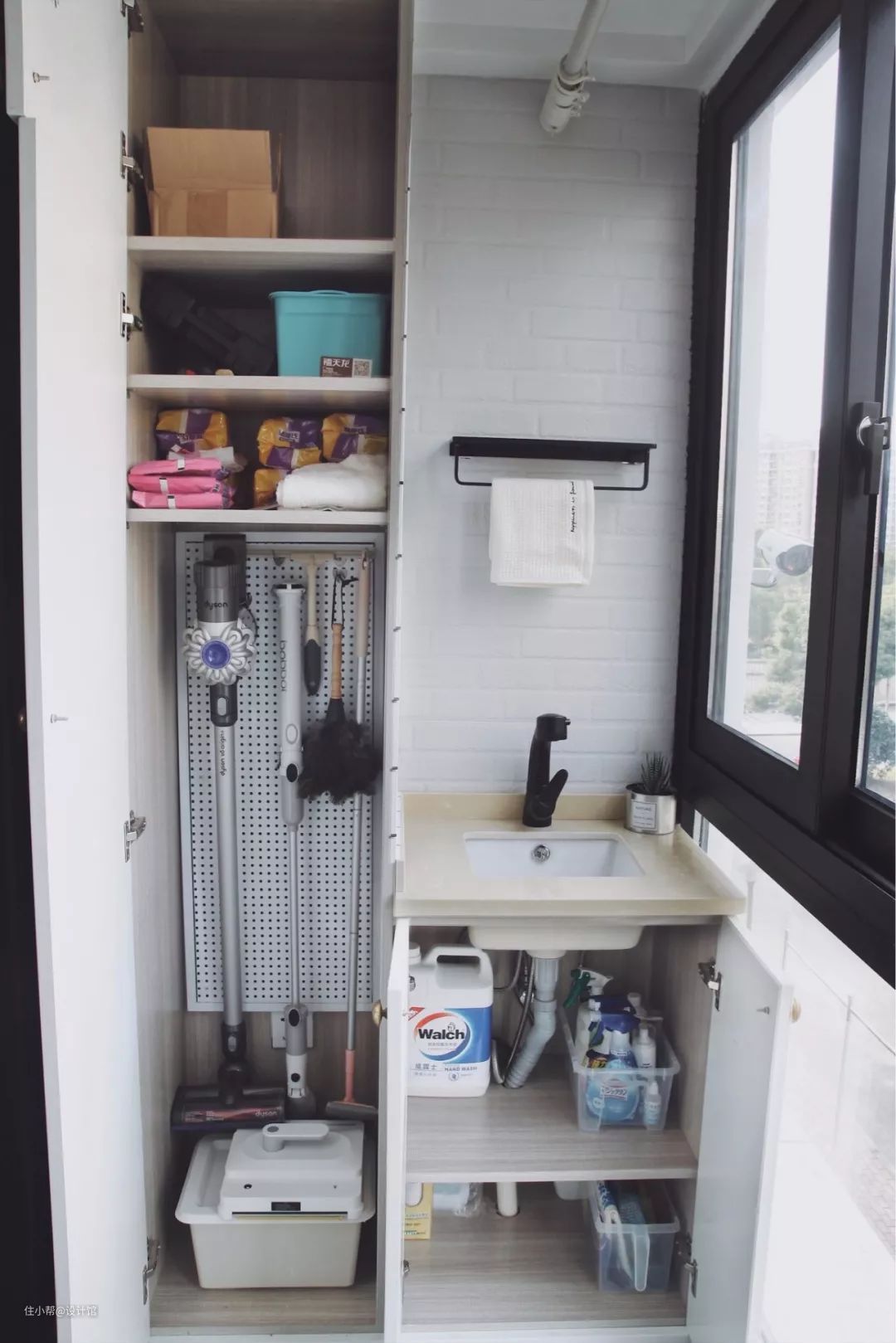 作为晾晒衣物的生活阳台,通常都会兼顾着日常家务的功能,如果这个家务空间的侧边空间留空闲置的话,完全可以装上挂钩,拖把扫把放在这里或挂在上面,也都是非常方便的选择。而且阳台一般也会留有龙头,洗拖把也有方便的操作空间。