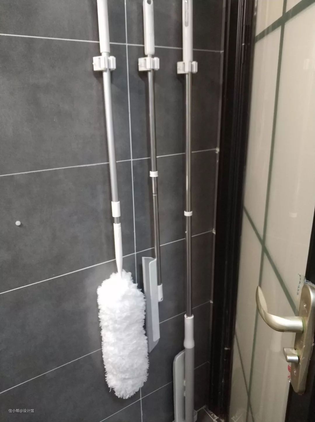 前面介绍的这些方案,都是利用卫生间墙面的设计方案,但是遇到一些卫生间利用比较紧凑的户型,那么也可以考虑把拖把扫把放到阳台等小空间了。