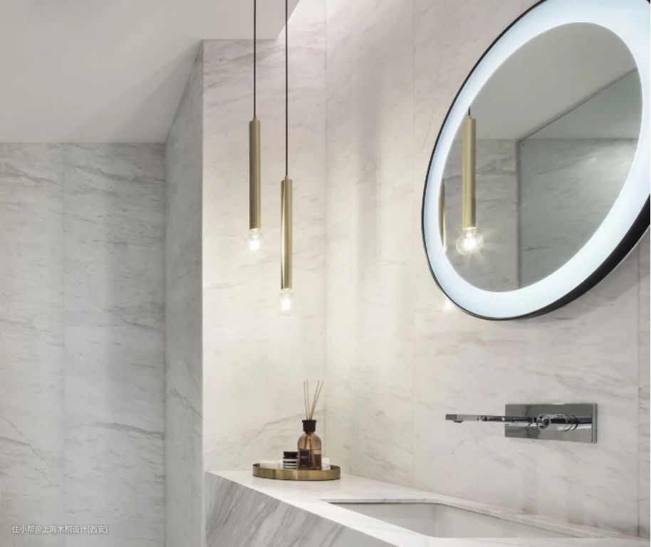 我们可以使用壁灯、吊线灯、镜前灯或是自带灯的镜子或镜柜,有条件的同学也还可以在台盆上下方设计灯带。有了正面光,照明效果会好很多。