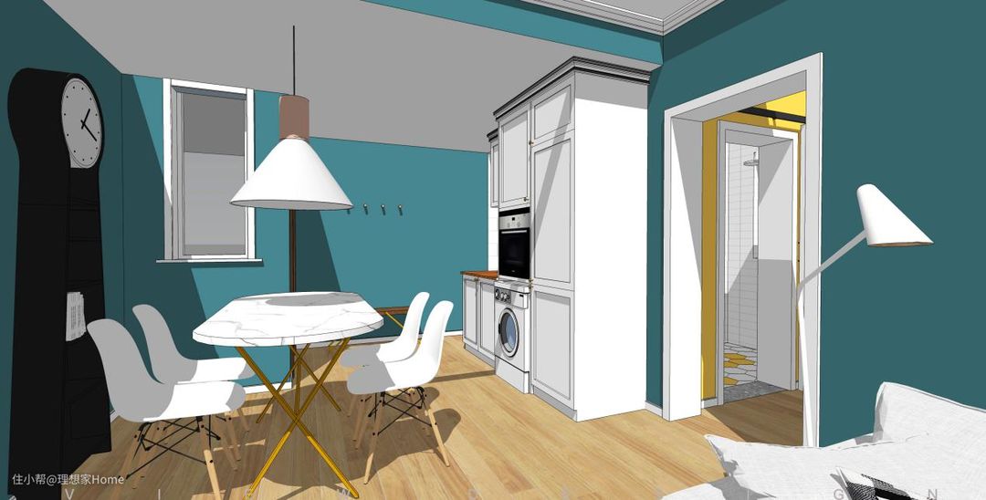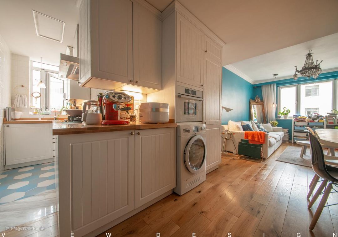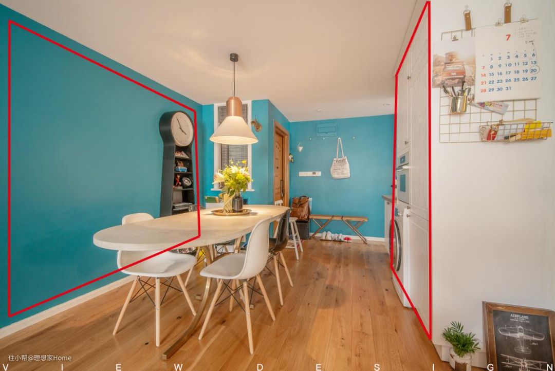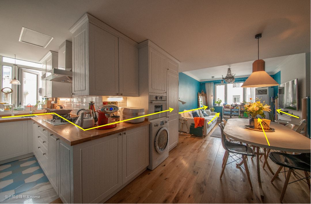 l 有效改善了动线,扩大了厨房的实际使用面积,尤其是储物空间这方面,冰箱与洗衣机以及蒸烤全部塞入。借用橱柜的边缘与餐桌做好餐厨区域的软性区隔使得空间使用上有区隔视觉效果上又有一体的大空间感。