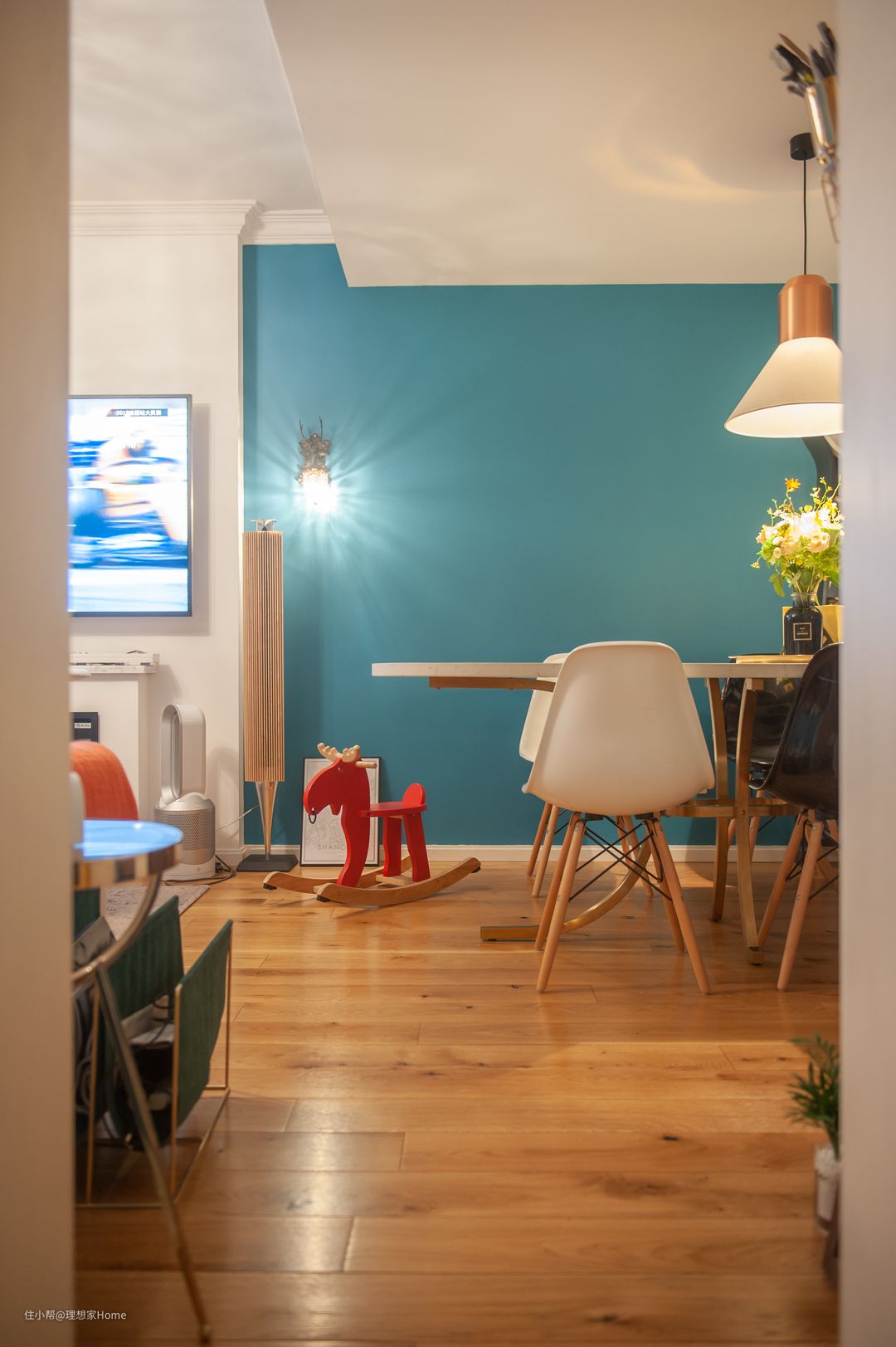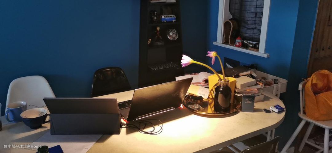 有许多设计师或者消费者会选择一个小一点1.4米或者1.6米的餐桌+一个独立的工作台。其实在这种选择中得到的是一个不能有很多人甚至不能放很多菜的餐桌以及一个施展不开的工作台。换一个思路用一个超过2米的大餐桌,但是可以兼顾在餐桌上办公则既可以获得较好的体验以及较好的视觉效果。因此,在本案中,我们最终选择了2.2米的餐桌+边上置物架用来切换功能时候放置物品。额外在阳台的飘窗位置做一个简易的办公区域。实际使用效果不错,尤其是做一些手工劳动,搭建模型等操作时候效果要比分开放置更好。