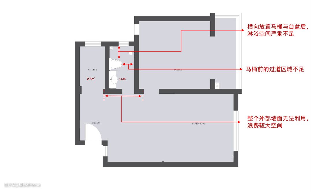 1,将厨房与厕所横向墙体完全割裂,导致剩余空间无法利用。浪费了大概有2-3平方的空间浪费。