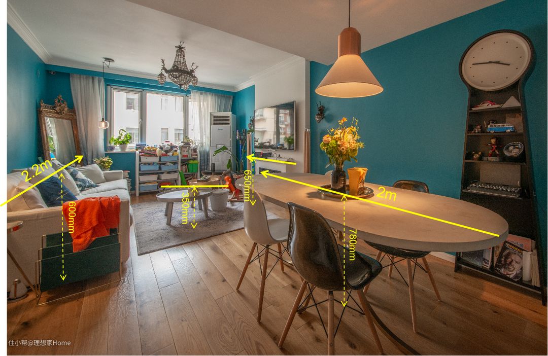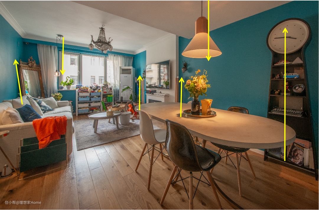 本案中的视觉延伸线即以2米长的餐桌与沙发为主,所有其他家具没有比这条线高的产品,因此起到较好的眼神效果。