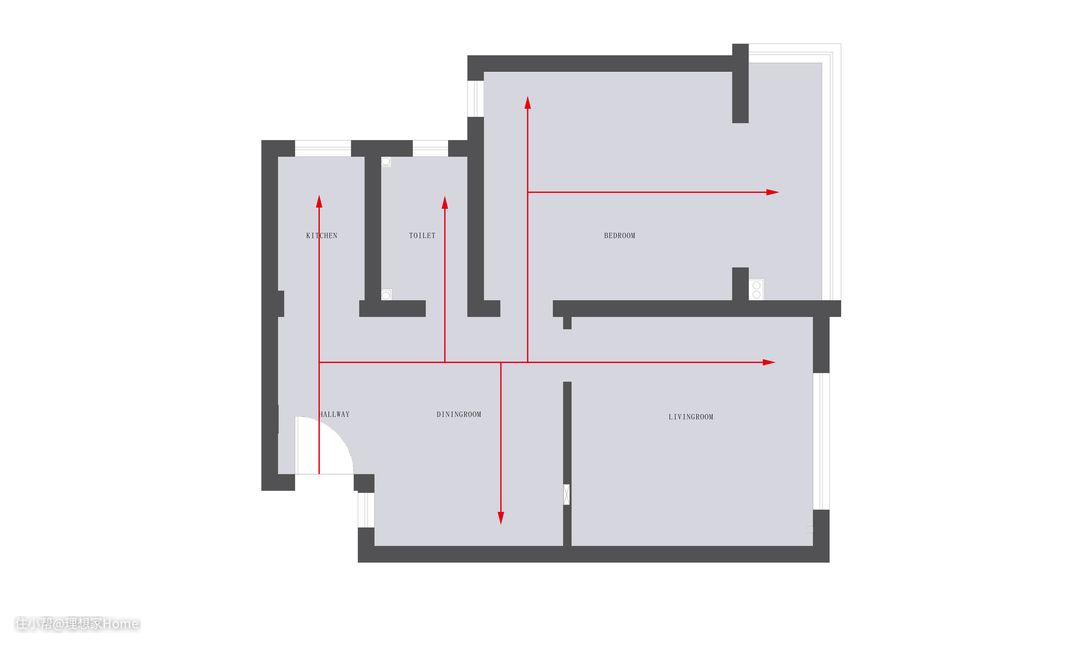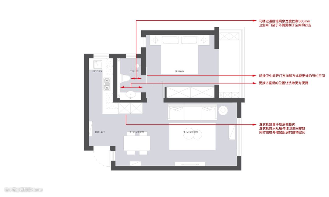 因此,尽可能通过改善动线来进节约空间,扩大可使用面积是空间整理的一个重点。深入思考后可以发现,主卧与厕所的墙面浪费是不可避免的,于是将厕所改换开门位置到卧室,并且改成外移门以此重复利用该片区域,并且节约厕所与厨房外部墙体空间。