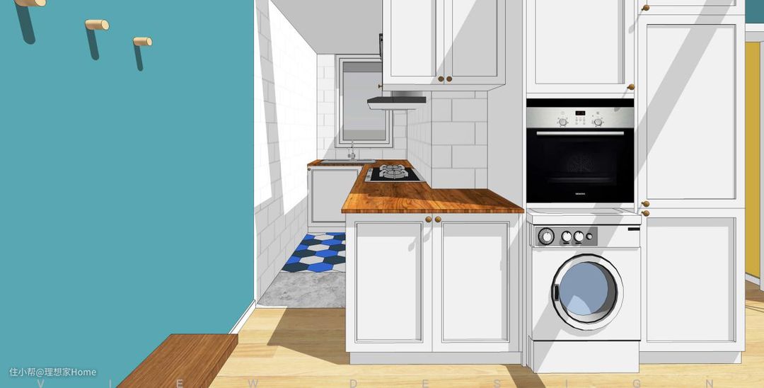 其次,其他延伸线也可以扩展视觉效果,比如本案的厨房中,由于整体都是白色家具,为了更好的呼应地板颜色,所以选用了同样的橡木色打造了Z字形的实木台面。通过两个转角突出线条的延伸感。