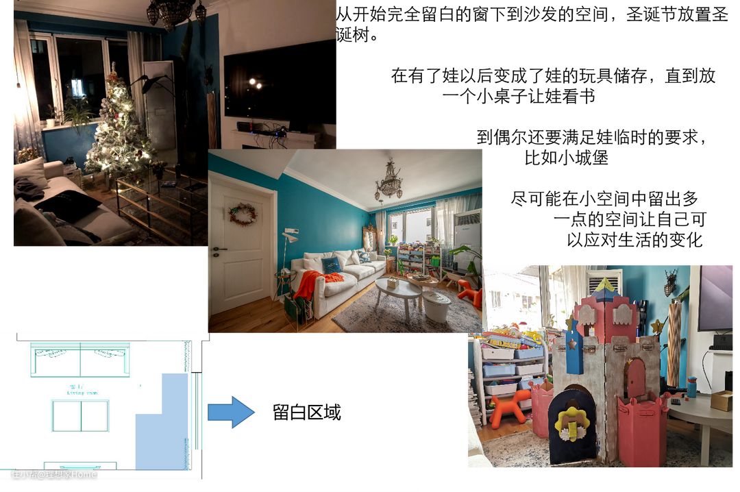 关于留白的最大可能往往来自于出生的小宝宝,因此很多时候即使小户型,也要为未来留点空间。最基础的包括宝宝婴儿床的空间要提前预留。另外还需要照顾到宝宝玩耍的空间。因此,我们提前留下了婴儿床的空间与其他需求空间。