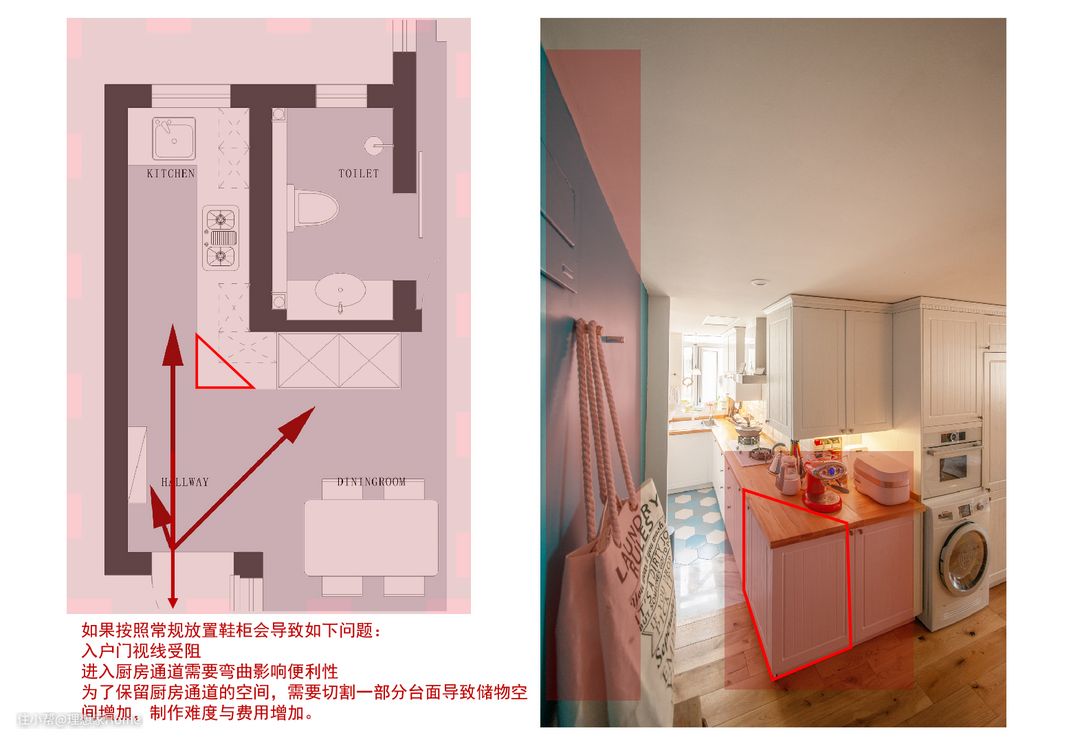 在通透感上首先应该注重的是,将中大块面积拆解成多个小面积使之不会对空间感形成遮挡,阻碍。并且保留相应的功能。在本案中的实际应用中,玄关位置就选用了这种方式。从户型图可知,玄关本身狭小并且与厨房一体相连,如果根据常规做法,在玄关边上制作鞋柜,衣柜,则一定会对人产生压抑感的同时影响采光。