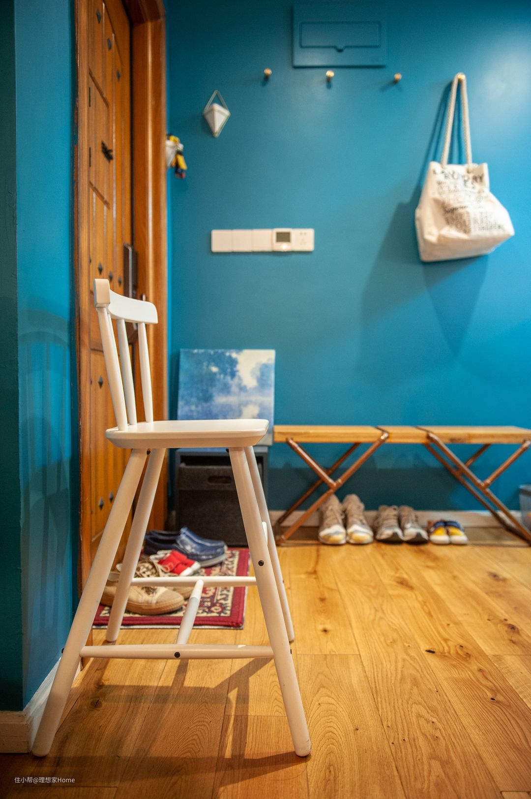 因此实际操作中,我们将功能分解为,墙面挂钩(挂包与衣物),自制长凳,换鞋凳。以及宜家的收纳框(收纳拖鞋,虽然我们家基本不用)以及边上宜家的儿童椅,放置包与换的衣物。另外放置一两个挂式花盆,放置钥匙等杂物。经过这样的操作,该区域可以获得功能性与视觉效果的平衡。