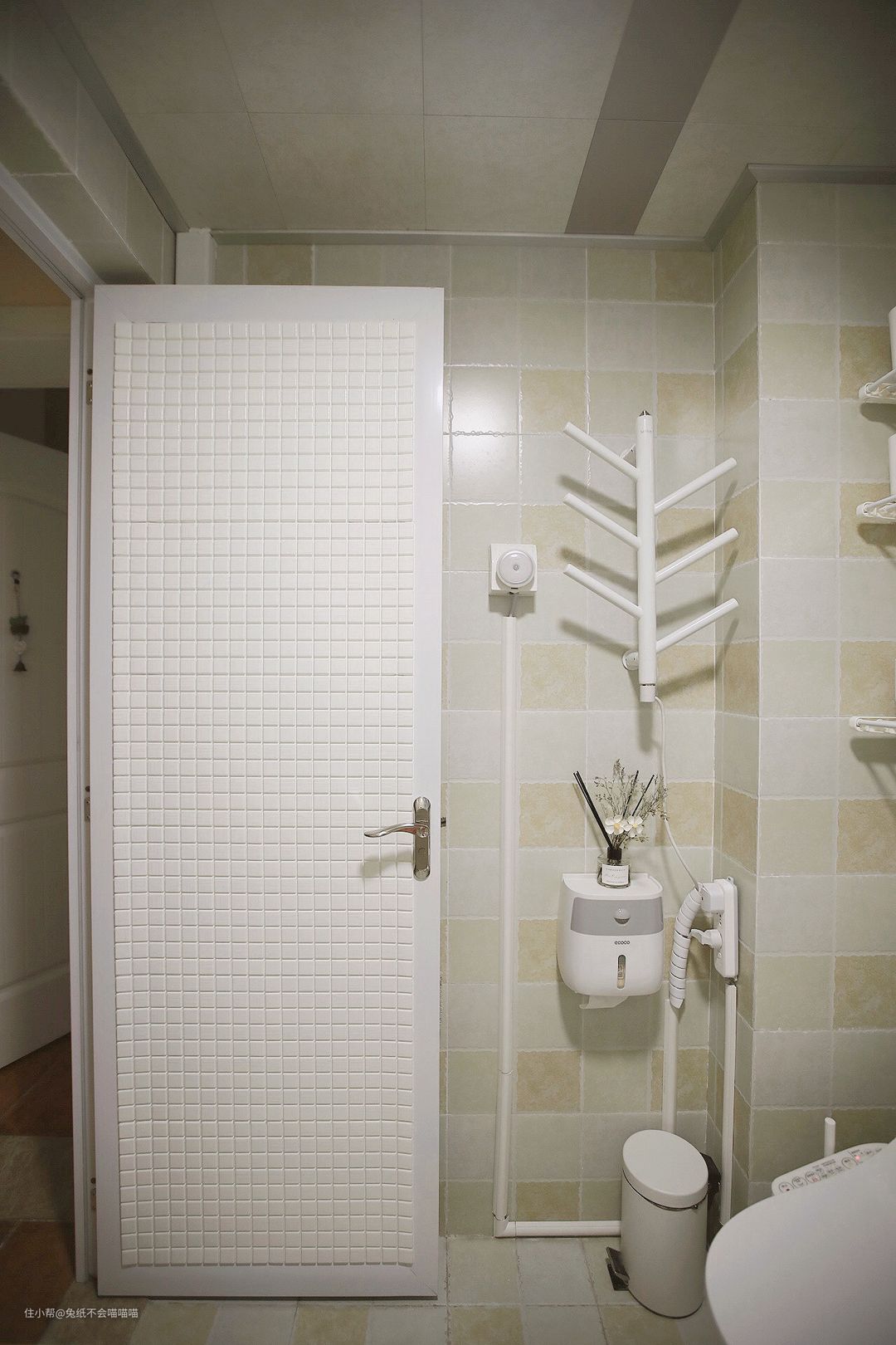 嫌弃厕所门不好看,原本是磨砂玻璃带一点条纹非常普通的款式,用贴纸把两面都贴了,看起来舒爽许多。