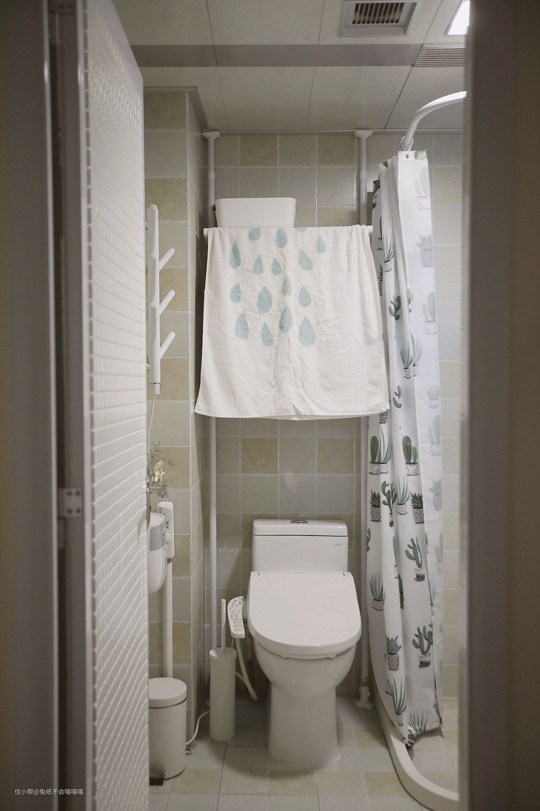 为了给淋浴多一点空间,马桶的位置往左挪了挪,设计师问我正对着门口会不会不妥,我表示不介意,后来在卫生间门口正对的过道处安上了纱帘,算补救上了。
