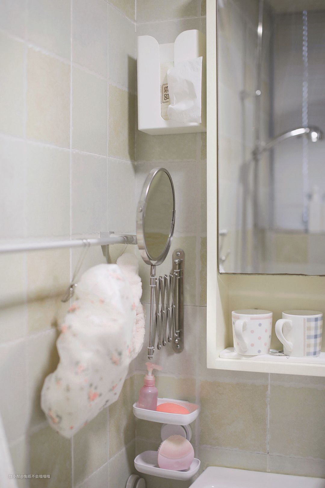 纸巾盒下面是宜家的伸缩镜,镜柜拉开后需要照镜子的时候使用,一面正常,一面放大,由于我习惯在厕所洗漱完后直接护肤,所以这个镜子可以说是派上了大用场,照痘痘照黑头什么的不要太方便。这款镜子网上也有免打孔的卖,不过我感觉它需要经常拉伸,打孔会更放心一点。