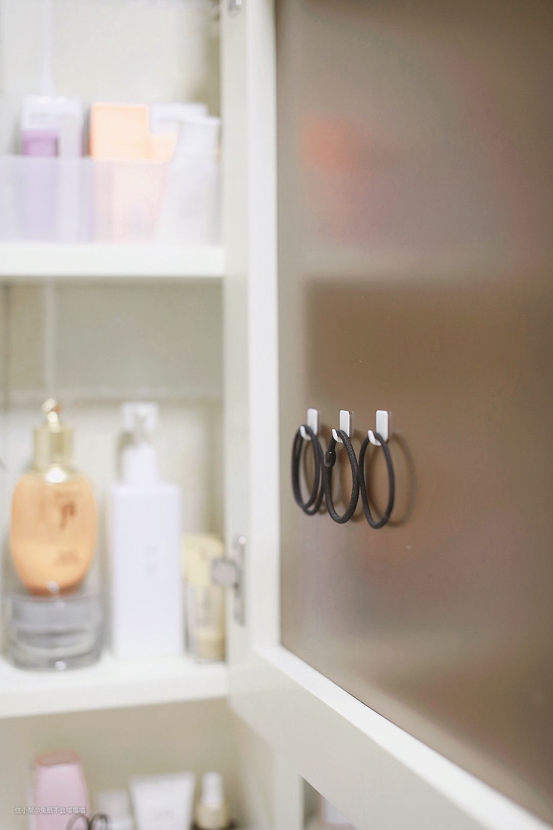 超迷你的小挂钩,粘着镜柜门后面,收纳皮筋棒棒的。