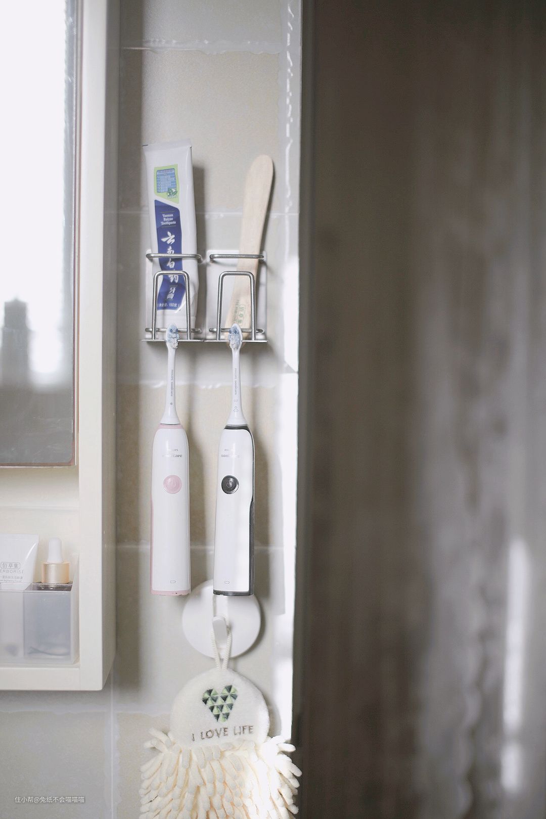 镜柜右边的缝隙也利用上,其实距离够的话,牙刷杯子也是可以倒扣着收纳在这个架子上。我用来收纳了牙膏,牙刷,由于这个架子中间有个圆形的孔洞,用来晾干刮面膜的木棍也是非常合适。