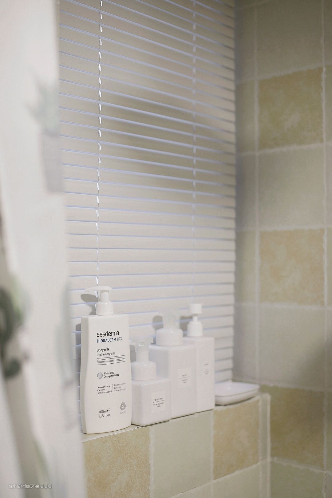 窗边形成了一处天然的壁龛,不然淋浴用品还真是不好安置,定制了一块百叶窗帘,让卫生间看起来更清爽了,也是免打孔安装,绝了。